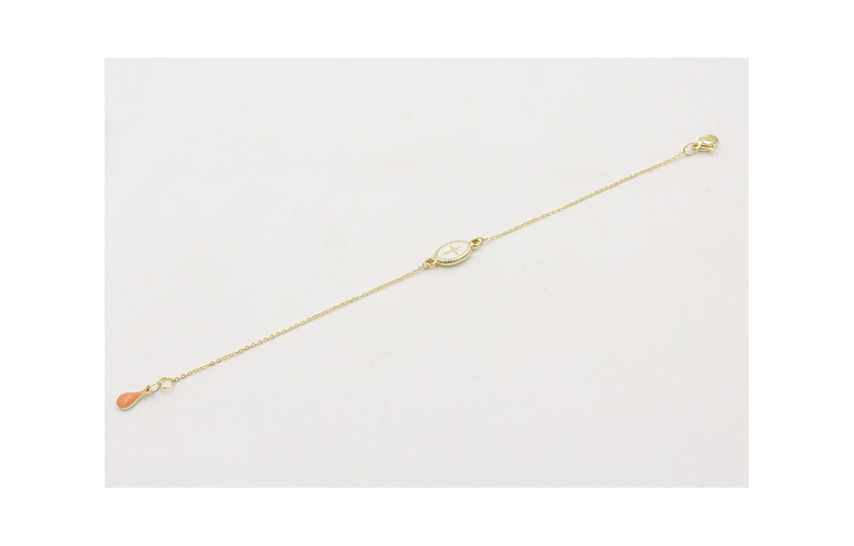 Pulsera de acero inoxidable con cadena de eslabón pequeño entrepieza cruz esmalte blanco rematada con gota esmaltada salmón. Largo 17cm.