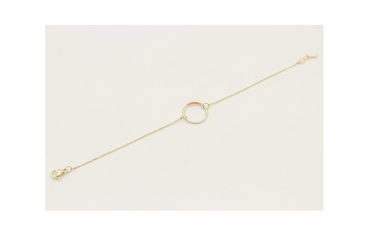 Pulsera de acero inoxidable con cadena de eslabón pequeño con aro esmaltado coral y beige, rematada con gota esmaltada blanca. Largo 17cm.