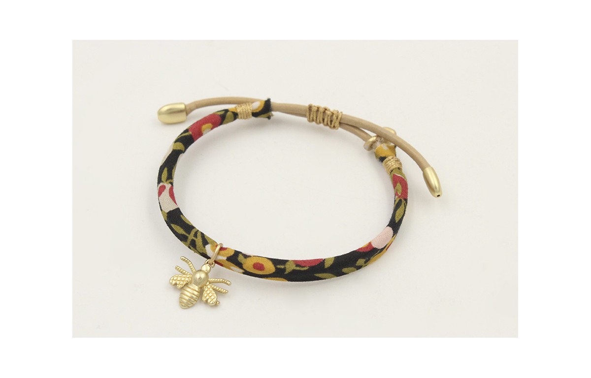 Pulsera regulable de cinta liberty en tonos marrones rellena de cuero natural con colgante de abeja en oro mate.