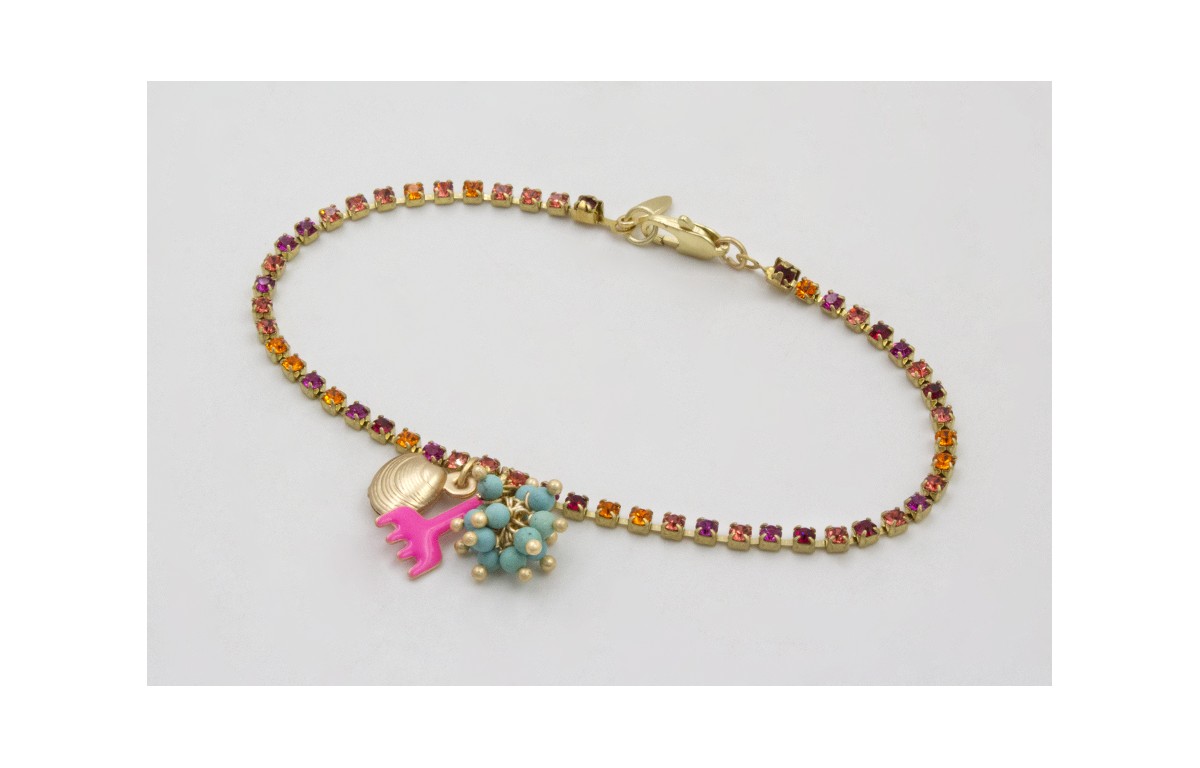 Pulsera cadena de strass naranja, rosa, fucsia con burruño de bolas turquesas, colgante almeja dorada mate y rastrillo esmaltado fucsia. Largo 17cm.