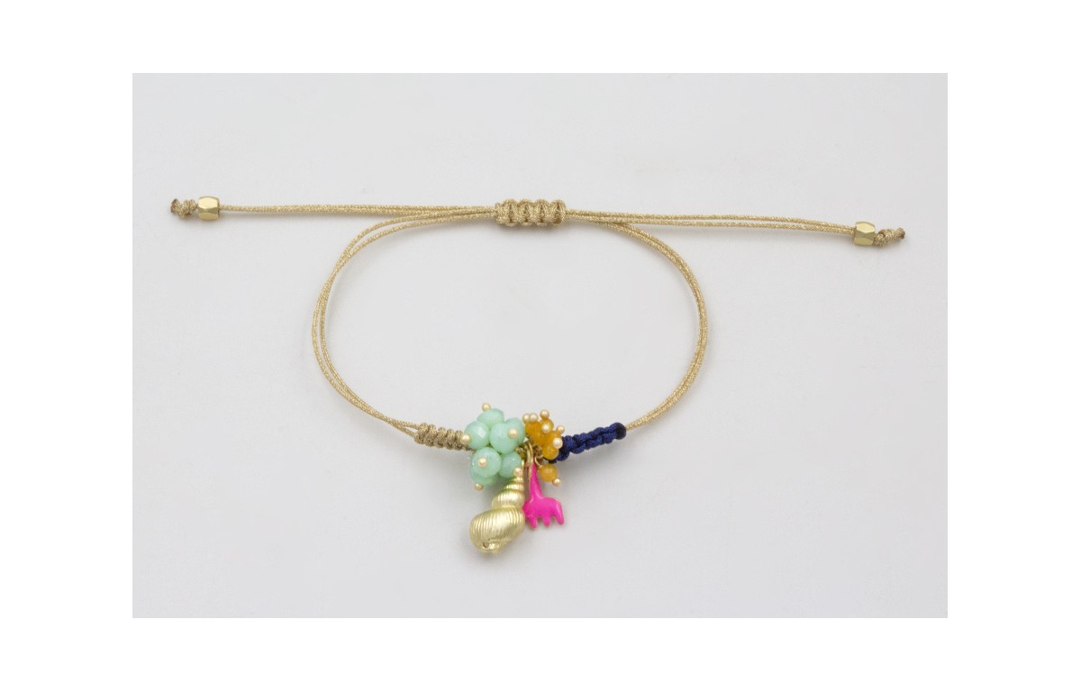 Pulseras hilo dorado con caracola dorada mate, rastrillo esmaltado fucsia, burruño bolas semipreciosas y nudo macrame azul marino. Es regulable.