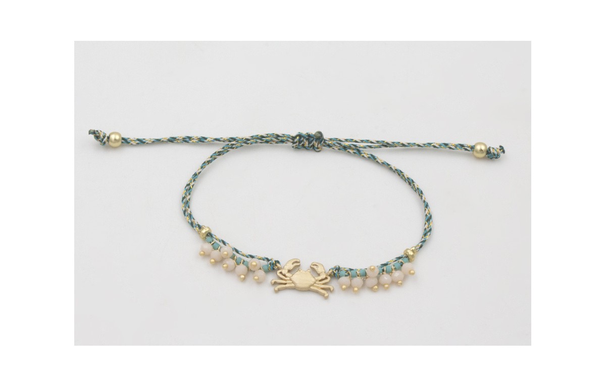 Pulsera micro driza azul, gris y oro con cangrejo dorado mate, miyuki turquesa, facetadas opal y rematada con nudo macramé. Es regulable.