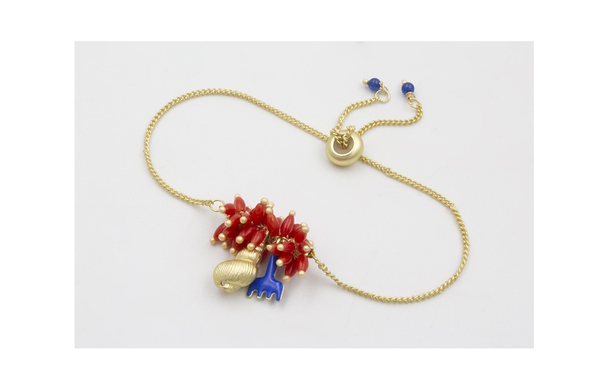 Pulsera regulable cadena eslabón plano dorado mate, burruño coralitos, caracola dorada mate y rastrillo esmaltado azulón. Es regulable.