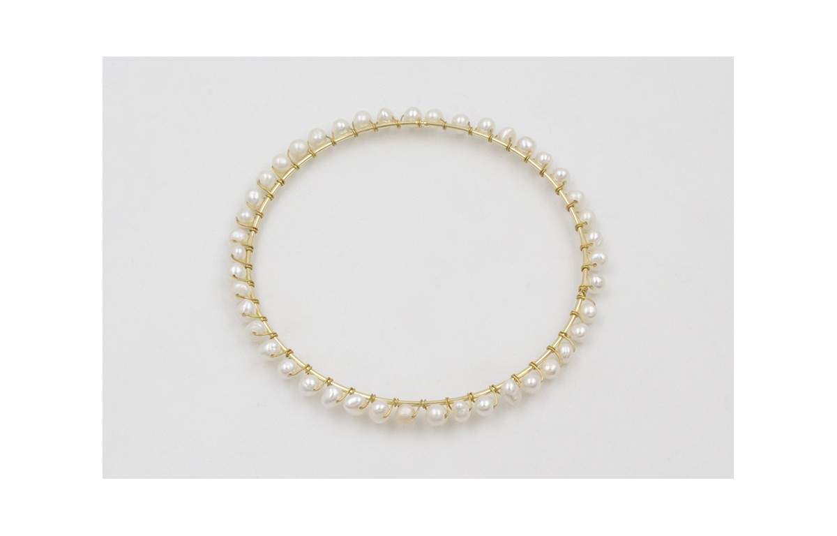 Pulsera rigida dorada con perlas naturles cosidas alrededor.