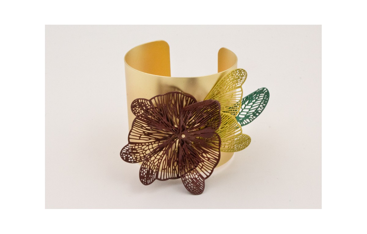 Brazalete rigido con alas mariposa esmalte marrón haciendo roseton, alas mariposa esmalte mostaza y ala libélula verde.