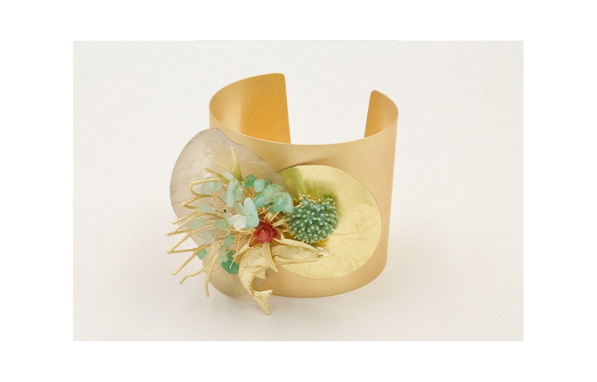Brazalete ancho con centro lentejuelas disco dorada y beige con rama coral dorada mate,pez,flor pétalos desiguales, rama chips jade y nenufar esmaltado turquesa.