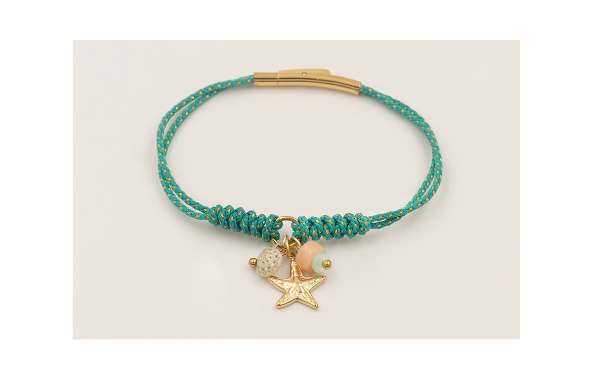 Pulsera cordón hilo dorado color turquesa con cierre tubo acero inoxidable, estrella de mar, concha.
