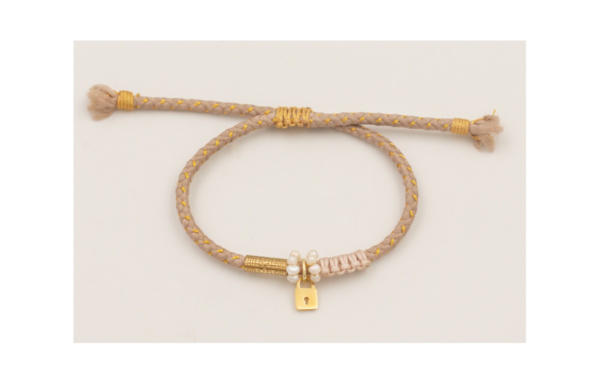 Pulsera cordón hilo dorado color beige con aritos de perlas, nudo medio macramé rosita, tubo y candado en acero inoxidable.