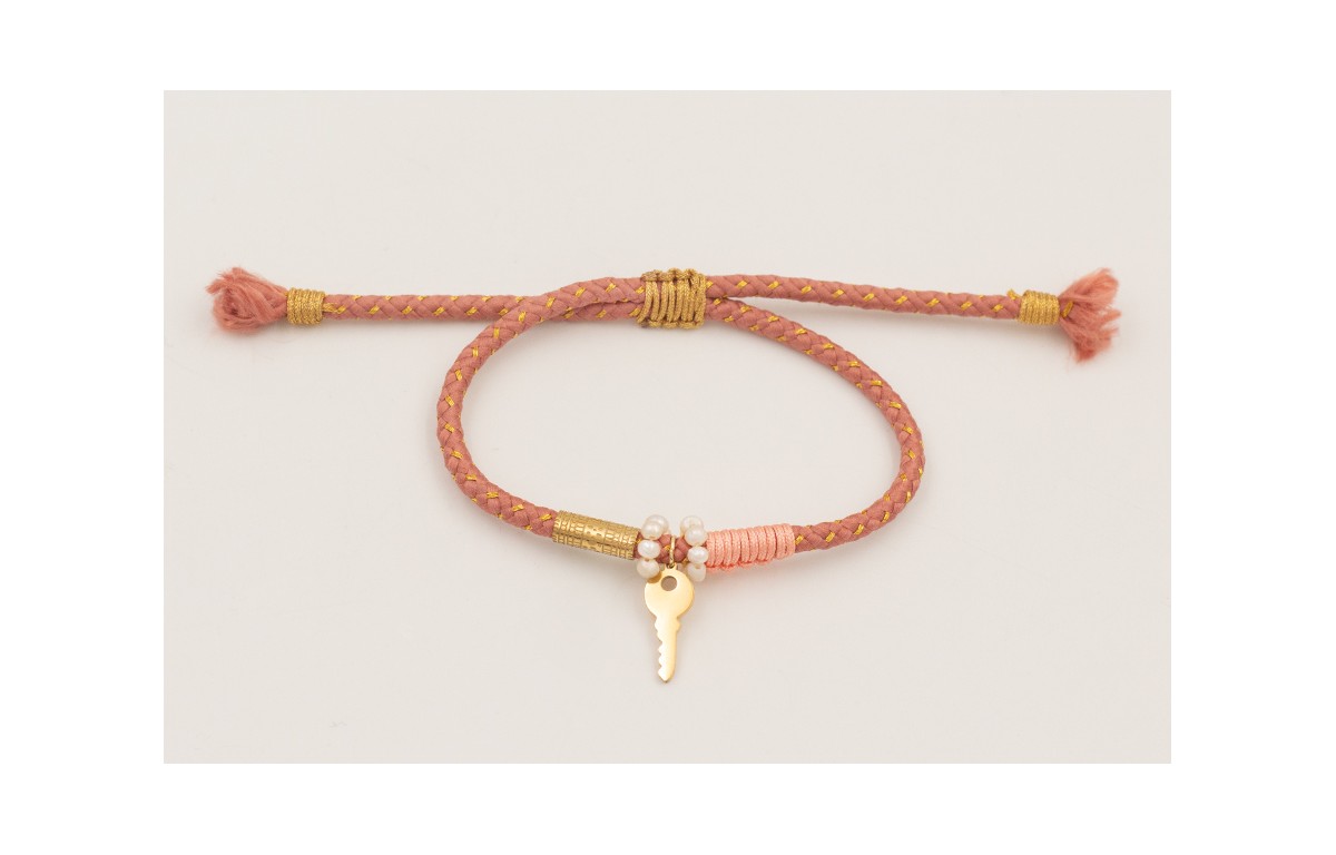 Pulsera cordón hilo dorado color rosa palo con ari