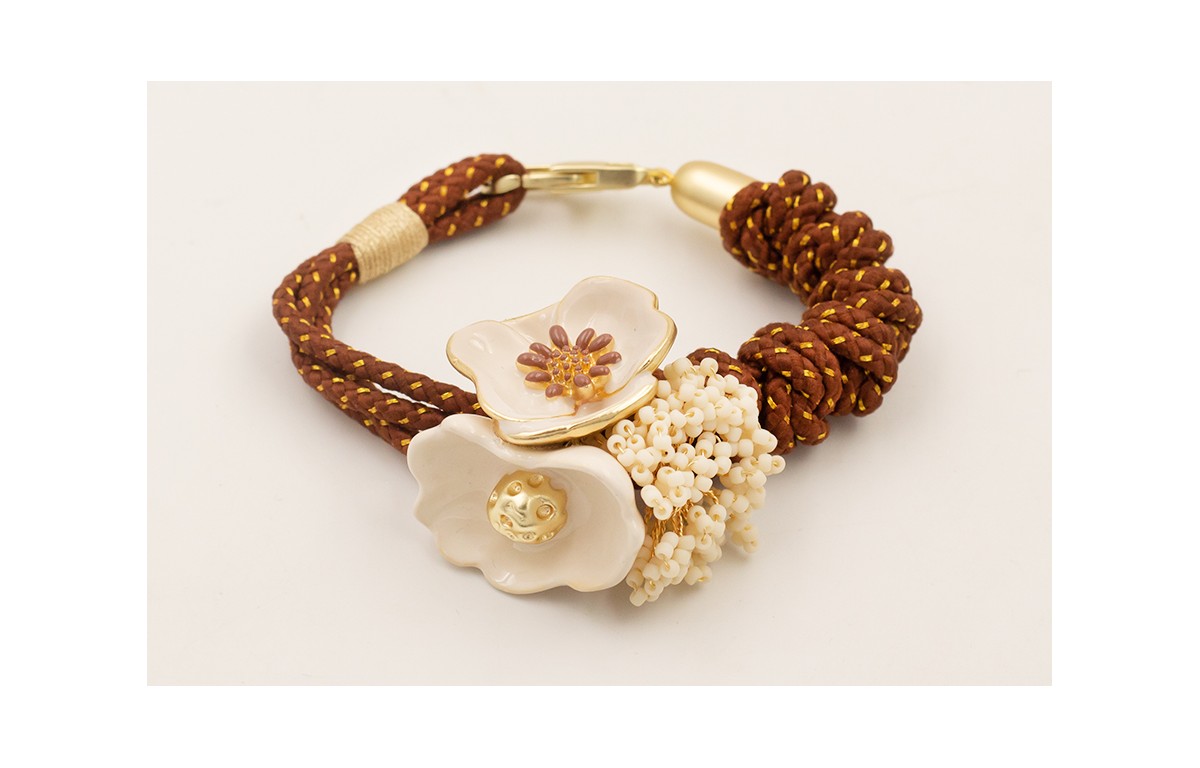 Pulsera cordón marrón con hilo dorado, flores esmaltadas beige, marrón, y ramilletes abalorio beige con cierre mosquetón plano dorado mate.