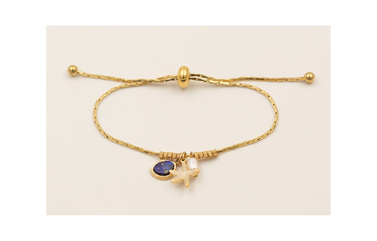 Pulsera cadena cordón ACERO INOXIDABLE con medio nudo macramé colgnate piedra azul, perla natural, estrella esmalte blanca.