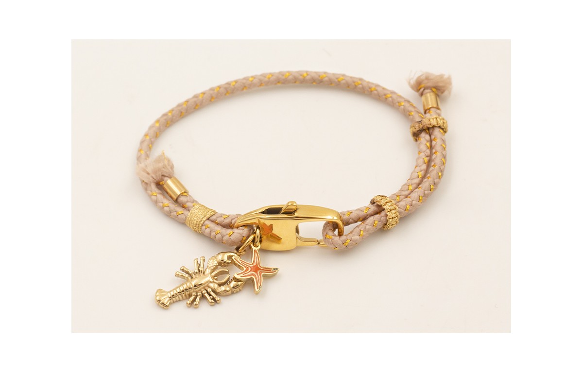 Pulsera cordón hilo dorado color beige con cierre mosquetón plano ACERO INOXIDABLE con langosta y estrella esmaltada coral.