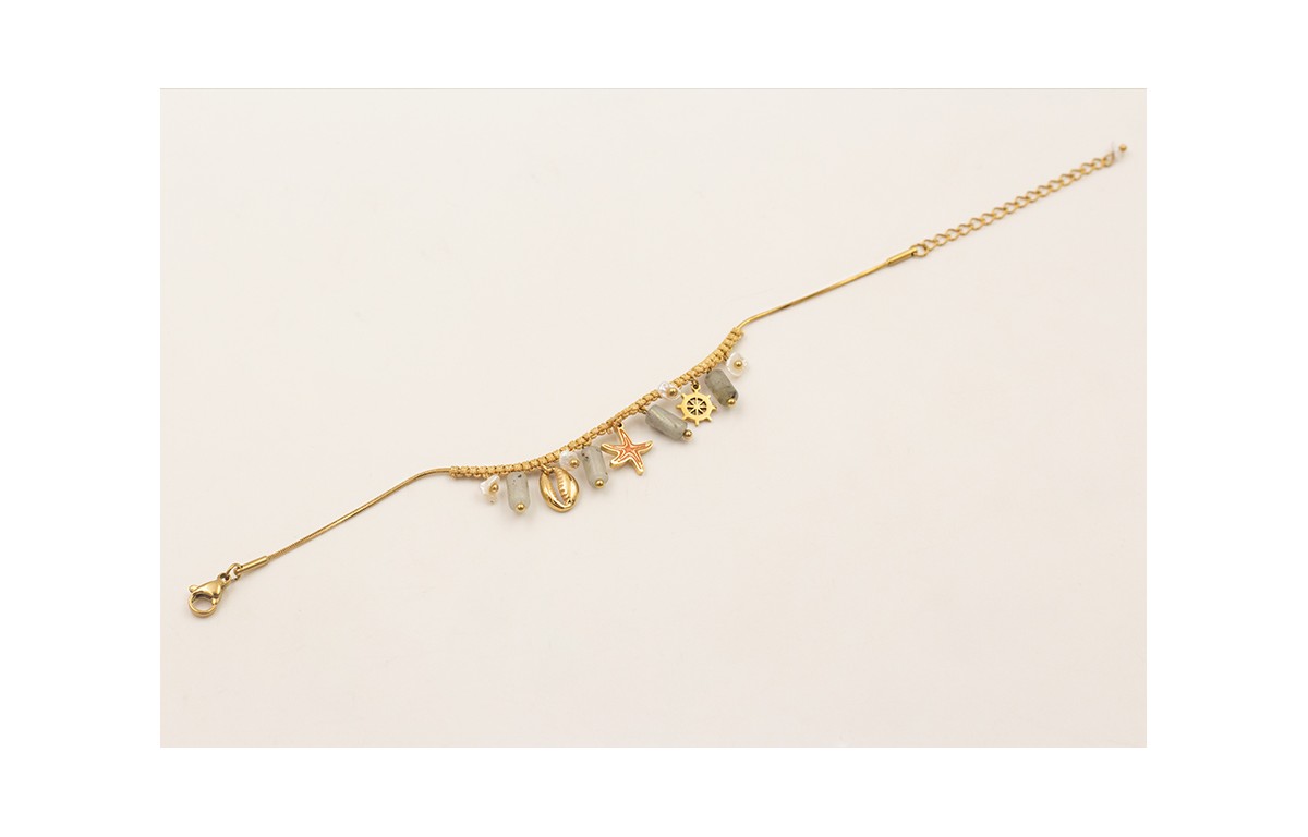 Pulsera ACERO INOXIDABLE hilo con nudo macramé dorado, tubos piedra gris, colgante estrella esmaltada coral, concha, timón, chip perla natural.