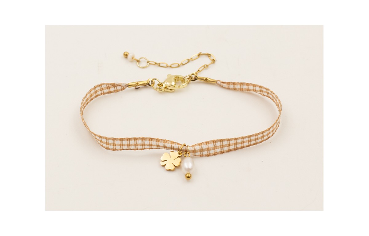 Pulsera ACERO INOXIDABLE con lazo vichy cuadros mostaza, colgante trebol y perla natural.