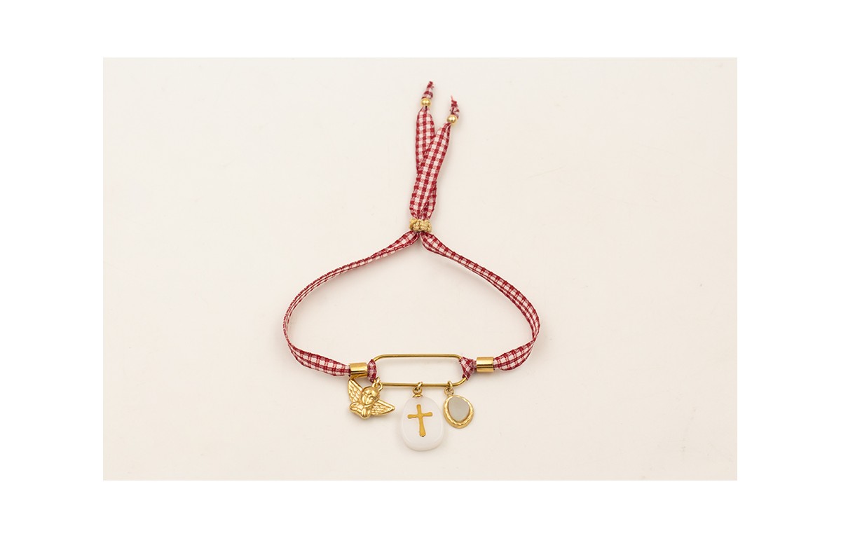Pulsera ACERO INOXIDABLE eslabón alargado, colgantes angel, cruz sobre pastilla resina, piedra azulada con lazo vichy cuadros burdeos.