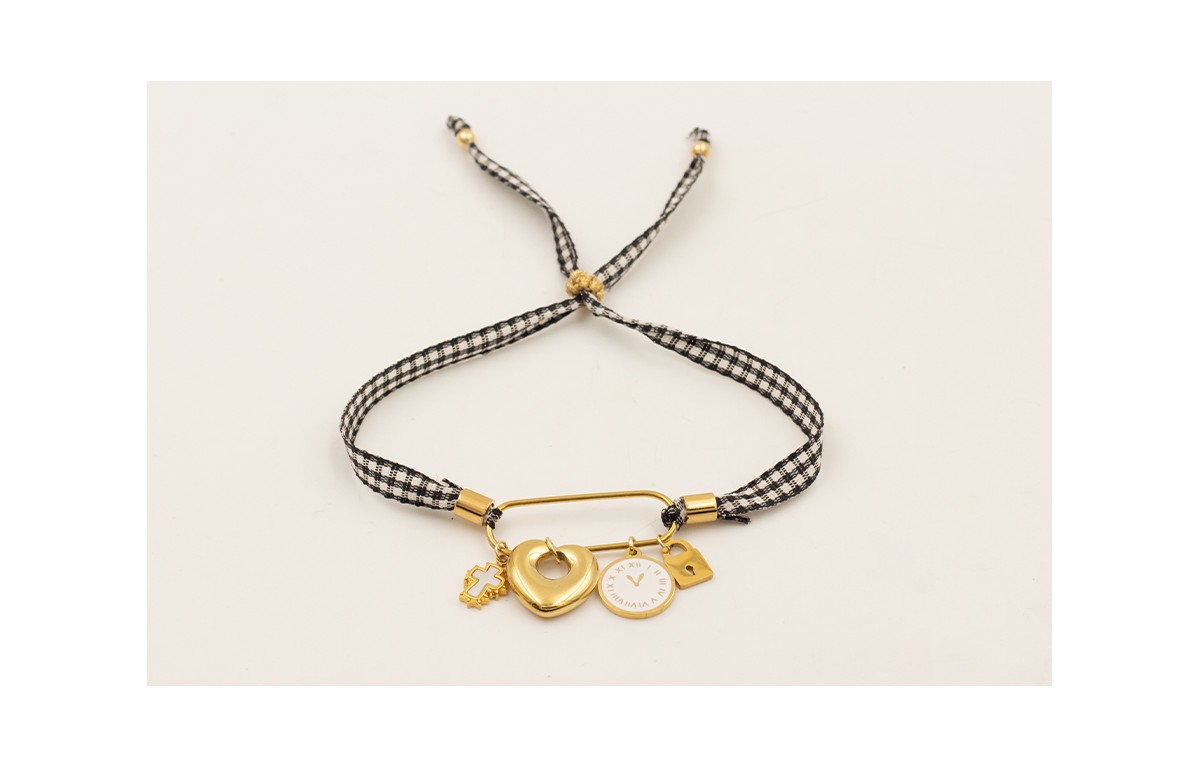 Pulsera ACERO INOXIDABLE eslabón alargado, colgantes candado, reloj esmalte blanco, corazón, cruz nacar con lazo vichy cuadros negros.