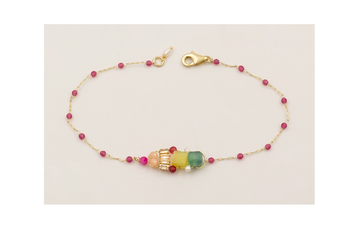 Pulsera cadena facetadas color frambuesa con centro cadena strass rectangular cristal, facetadas, cubos y perlas naturales.