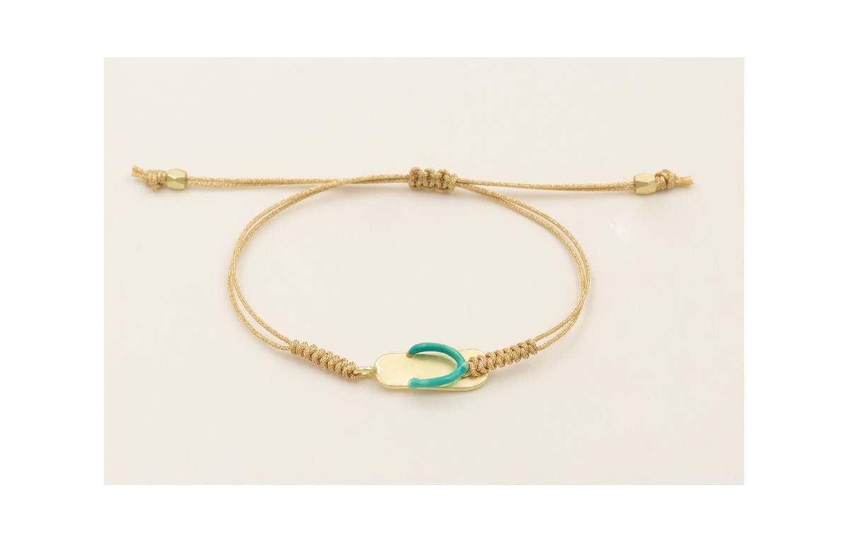 Pulsera cordón dorado con nudo serpiente y chancleta esmaltada azul.